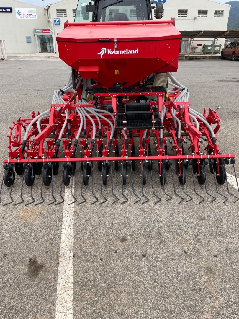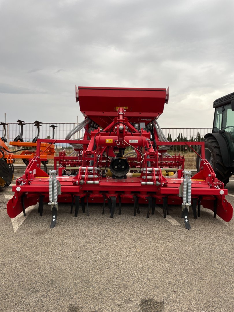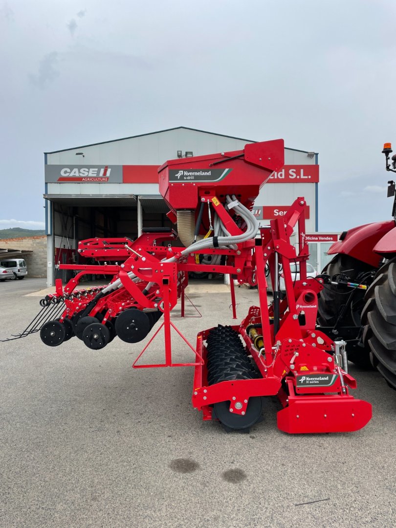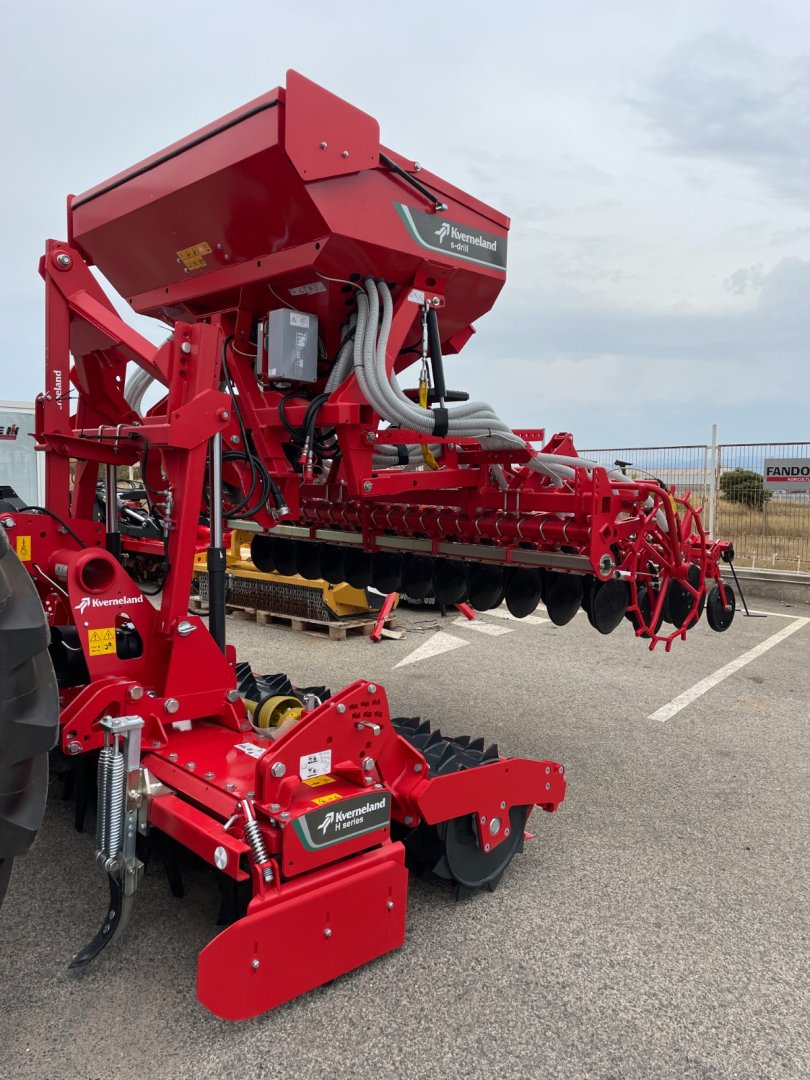 Sembradora KVERNELAND S-DRILL de 3 metros, con 24 discos de siembra y sistema Isobus, con montaje de grada rotativa delantera KVERNELAND H-Series de 3 metros con 12 rotores y 24 azadas, con rodillo trasero
